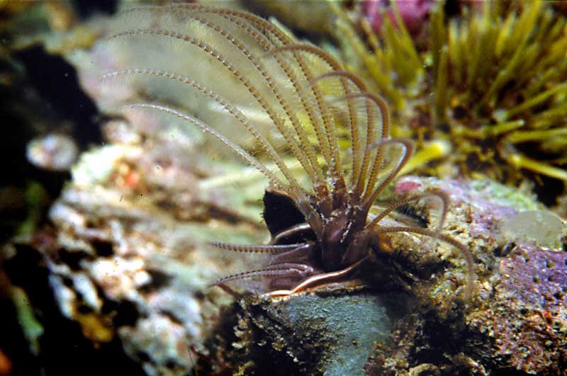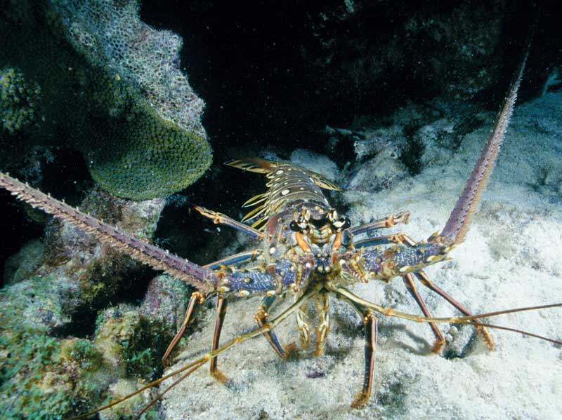The Spiny lobster, such as this Caribbean species, has no large chelipeds. Instead, it uses long, spiny antennae as weapons. Anyone who has ever grabbed one of these lobsters without gloves has felt the effectiveness of these antennae!