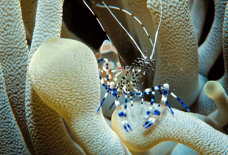 A Spotted Cleaner shrimp (Caribbean) hides among the venomous tentacles of an anemone, safe from predators. This shrimp uses its chelipeds to pluck parasites off fishes that come to the anemone for a cleaning. The shrimp gets a meal, and the fishes get cleaned.