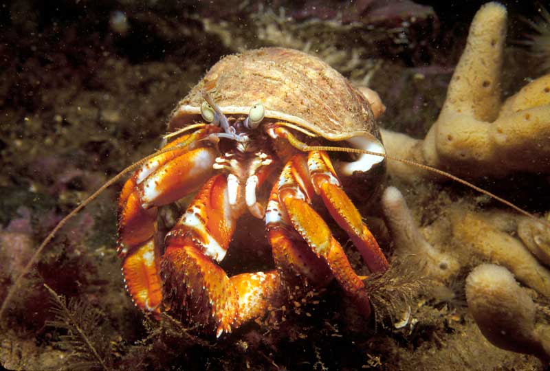 An Acadian Hermit Crab in New England lives in a snail shell. When it grows too large for the shell, it has to find another one.