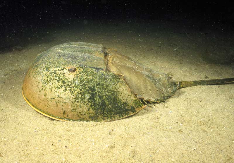 There are only five species in Class Merostomata, with just one found in American waters. The Horseshoe Crab (Limulus polyphemus) is more closely related to spiders and scorpions than to crabs!