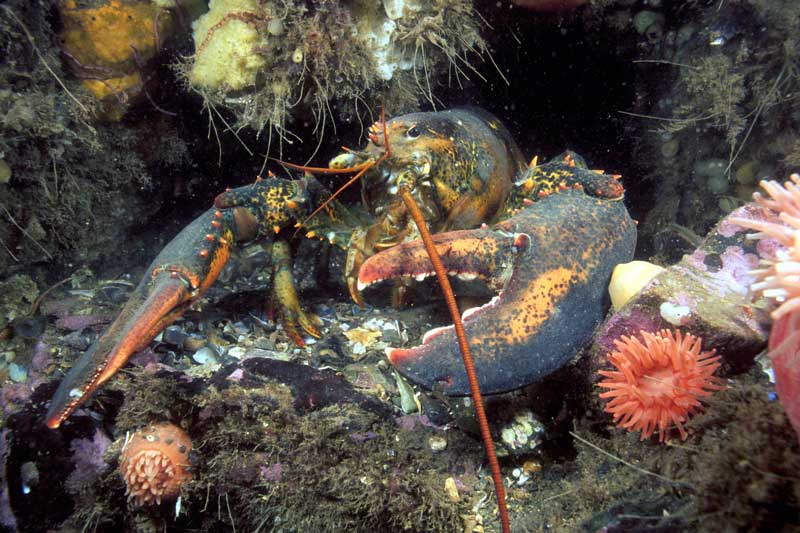 The Northern lobster, found in the northeast United States and Eastern Canada is a culinary favorite. It has large chelipeds more than capable of crushing the snails and clams on which it dines.