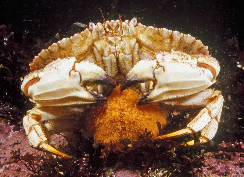 A female Rock crab, found in New England, holds her eggs under her abdomen. The orange ball of eggs contains thousands of baby crabs just waiting to hatch.