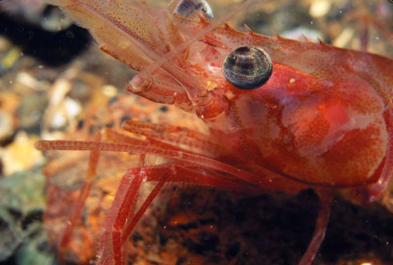 A close up of a shrimp’s eye (smaller than a pin head) shows the ommatidia of the compound eye structure.