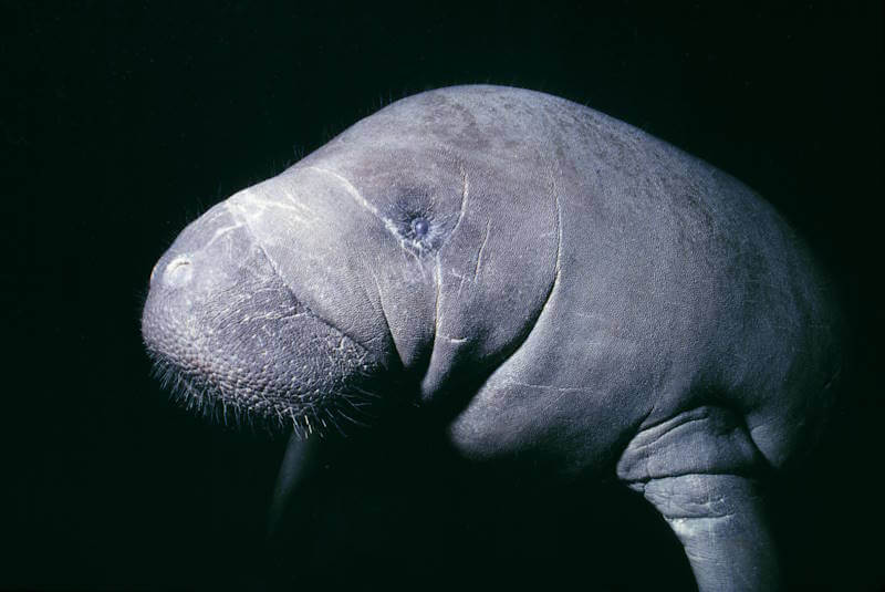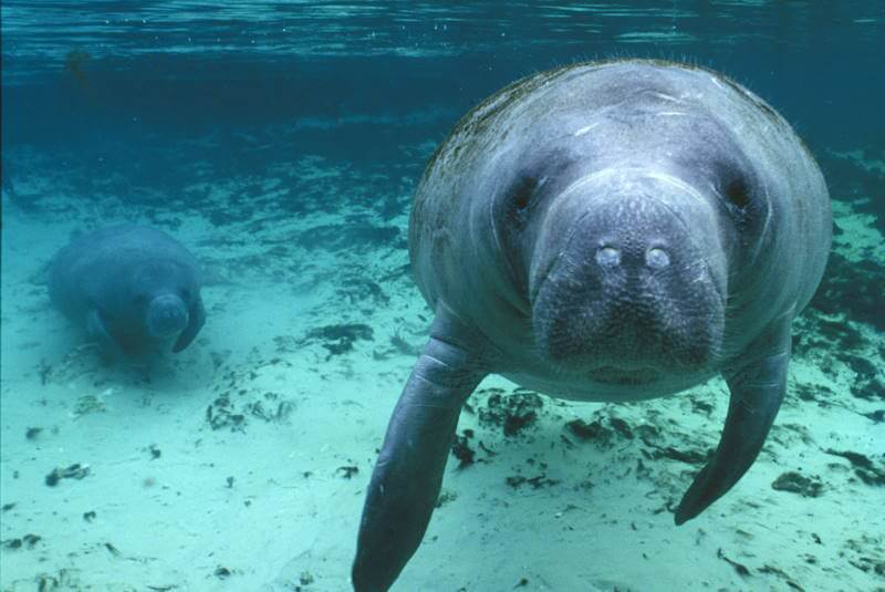 Manatees are large aquatic mammals sometimes called “sea cows” because they swim slowly and like to graze on aquatic plants. They are in fact completely herbivorous. There are three species of manatees (West Indian, Amazonian and West African) as well as a closely-related species called the Dugong that lives in the Pacific. They often move between salt water and fresh water to find their favorite foods.