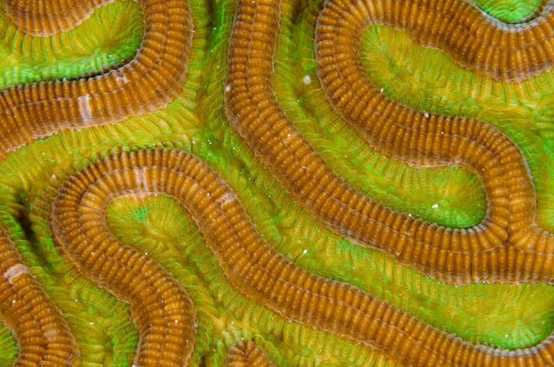 Close-up of interconnected polyps of Brain coral. The green zooxanthellae are quite obvious in this shot!