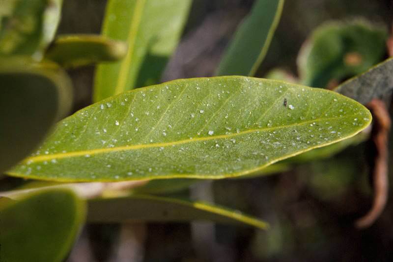 In some species, excreted salt crystals can be seen or tasted on the leaves! Another technique concentrates the unwanted salt in bark or older leaves. The plant periodically sheds the bark and leaves, taking the salt away with it.