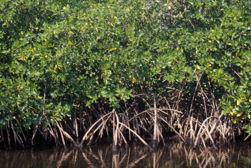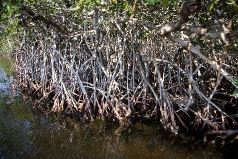 Since the mud in the mangrove is so thick with litter, bacteria, and the end result of lots of decomposition, it has very little oxygen. So instead of absorbing oxygen through their underground roots, like many plants, the mangrove plant has developed long roots which come up out of the water into the air before joining the trunk of the plant.