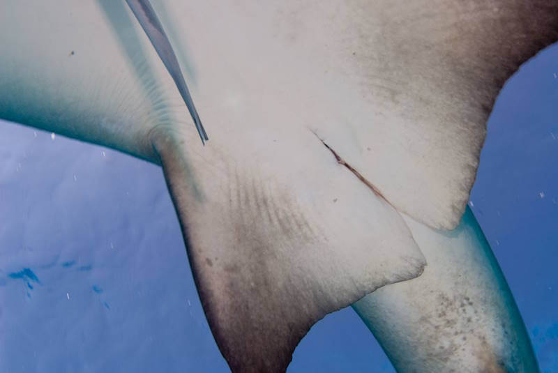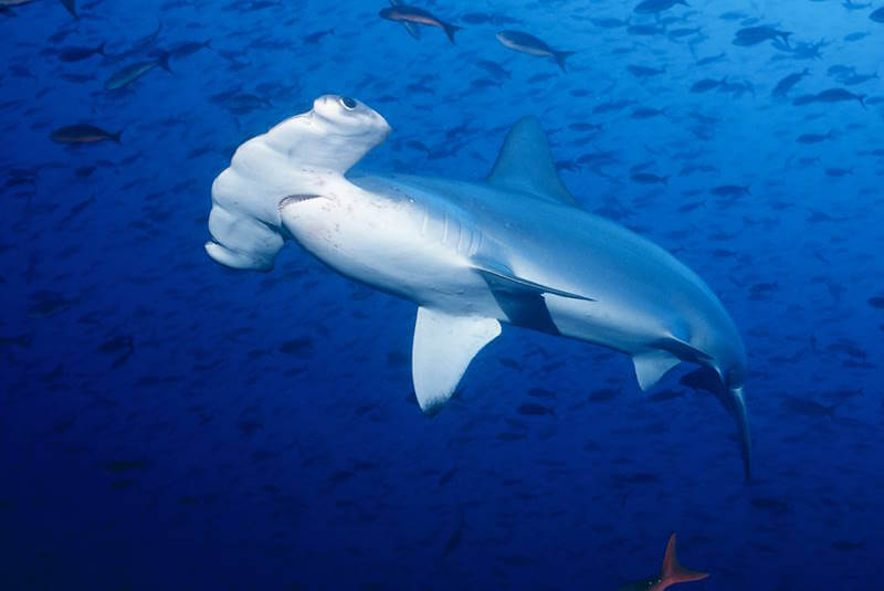 The Scalloped Hammerhead in the Galapagos Islands is extremely frightened of divers’ bubbles. These distinctive sharks use their unique head shape to enhance their electroreception abilities and to pin prey to the ocean floor.