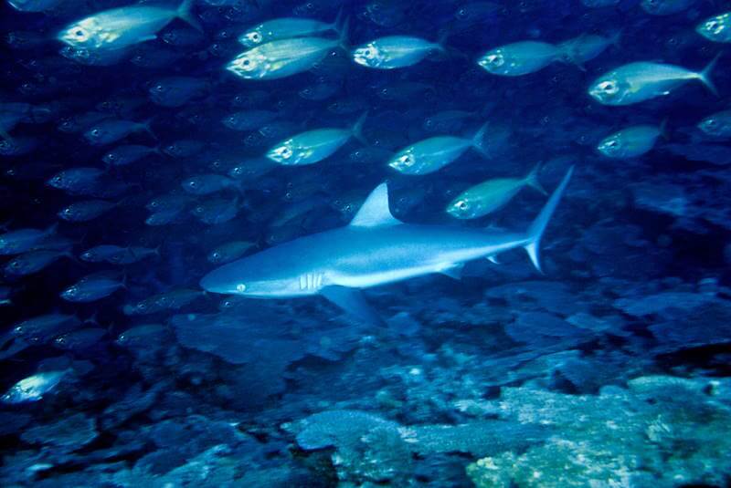 The Grey Reef shark (Carcharhinus amblyrhynchos) is common around Pacific coral reefs, feeding mostly on fish and invertebrates. They reach a little over 7 feet in length.