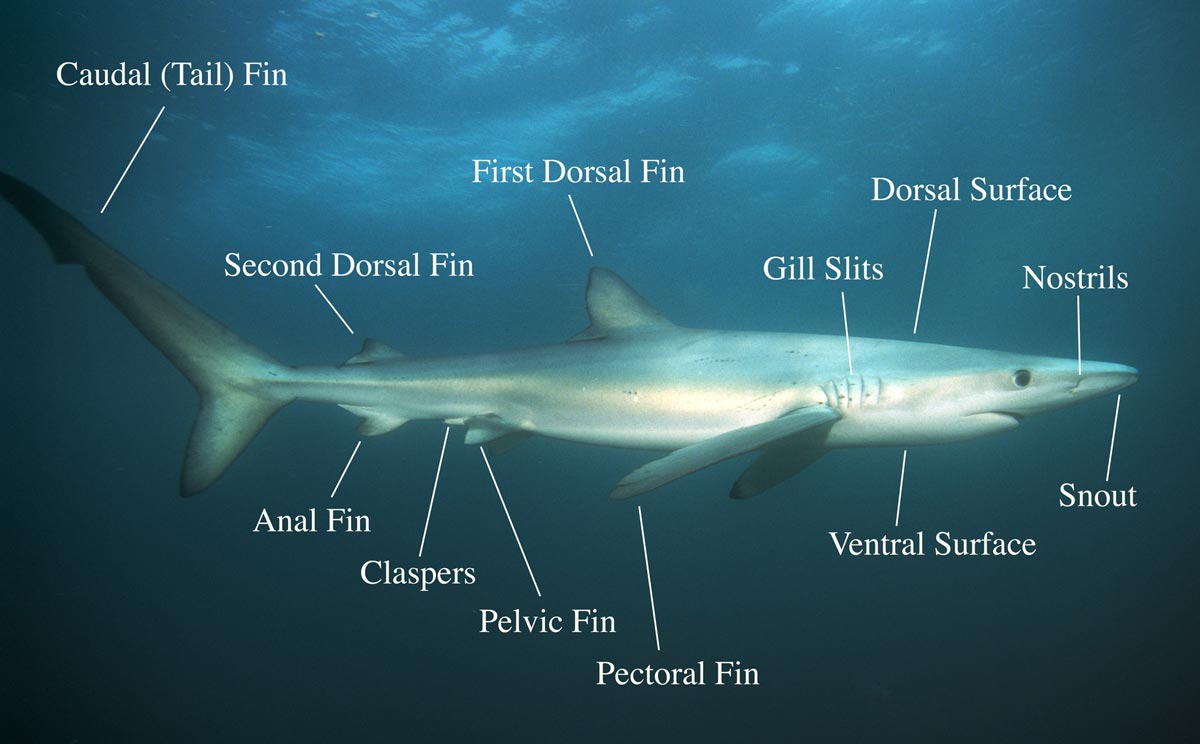 A picture of a shark with the various parts labeled
